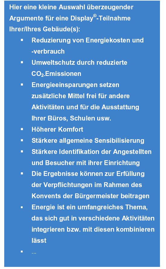 Zunächst gilt es, Daten zu erfassen und Poster zu drucken. Sobald Ihre Berechnungsergebnisse vorliegen, wählen Sie die Gebäude, deren Energieeffizienz öffentlich ausgehängt werden soll, und die Botschaft für das jeweilige Poster aus (einfache Aktionen und technische Lösungen). Vor dem Aushängen der Poster sollten Sie eine Gesamtkampagne planen und dafür Ihre Ziele und Zielgruppen abstecken. Ausserdem sollten Aufgaben und Zuständigkeiten verteilt, ein Budget und ein Zeitplan aufgestellt werden. |